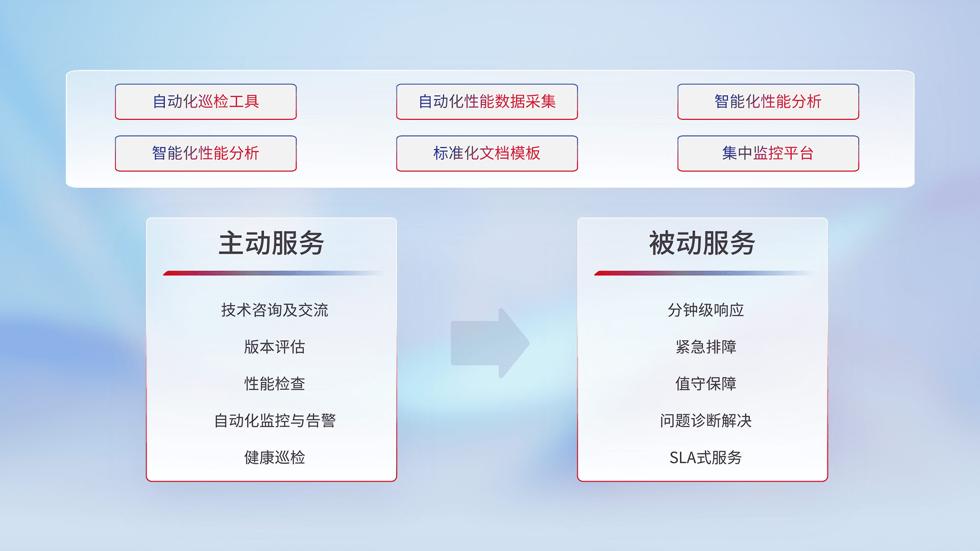 智能化工具和标准化文档,,,,保障服务质量,,,提供主动服务(包含技术咨询、、、版本评估、、、、性能检查、、、自动化监控与告警、、健康巡检)和被动服务包含(分钟级响应、、、紧急排障、、、值守保障、、、问题诊断解决、、、SLA服务)。。。